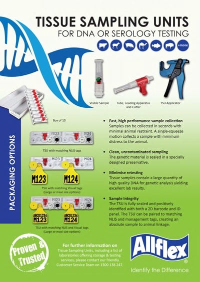 Allflex Tissue Sampling Units (TSU) provide all of this and much more. These units take an ear punch which can replace tail hair, blood, semen or other sample types used for DNA, Pestivirus or other serology testing.